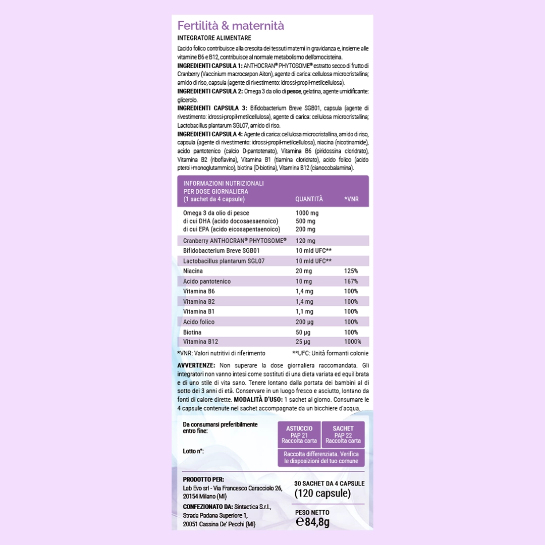 Grazie alla combinazione di probiotici, Omega 3, vitamine del complesso B e mirtilli rossi, supporta la fertilità, il benessere intestinale e il corretto funzionamento fisiologico e neurologico.